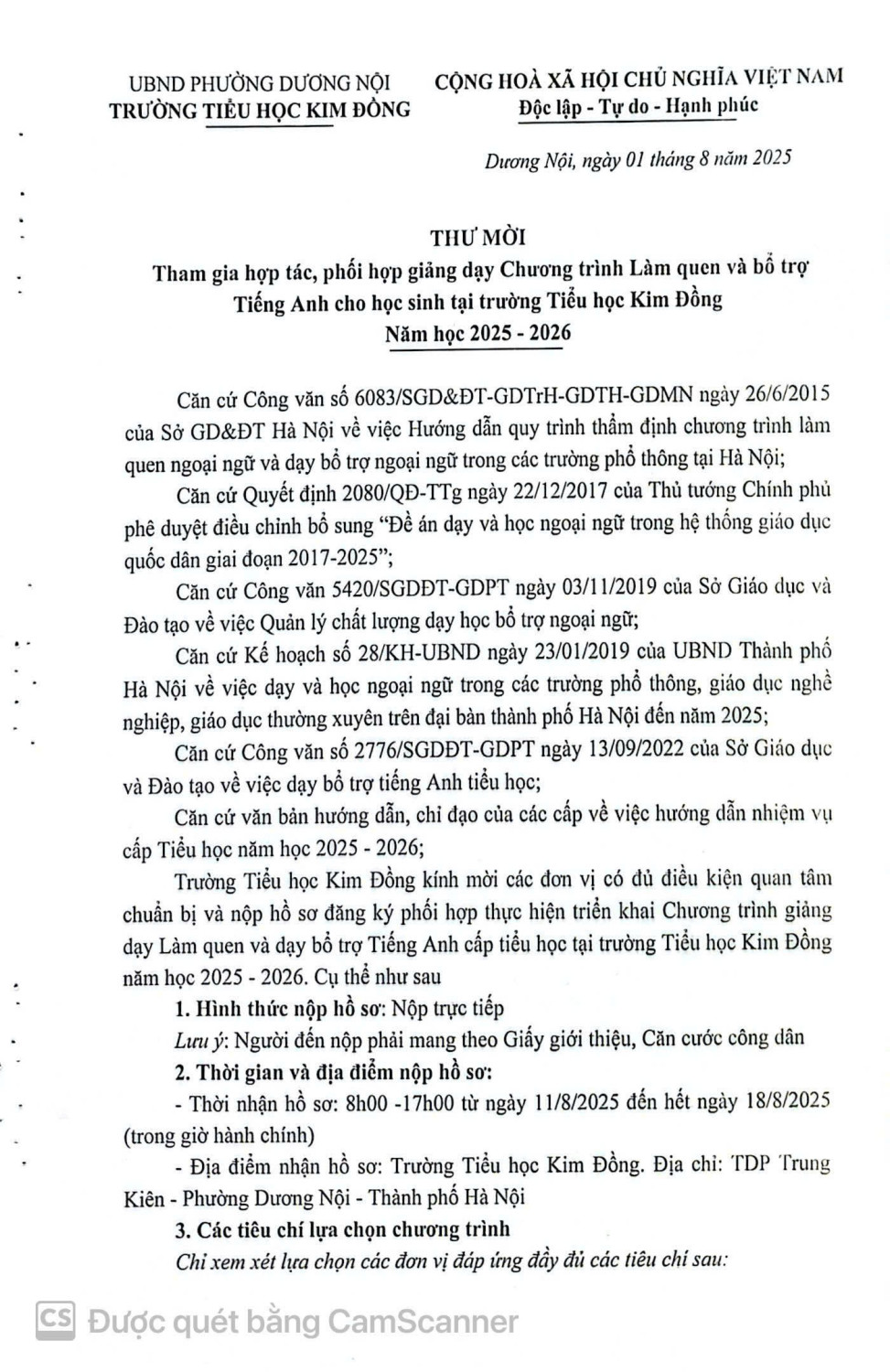 Thư mời hợp tác, phối hợp giảng dạy Chương trình Làm quen và bổ trợ Tiếng Anh cho học sinh