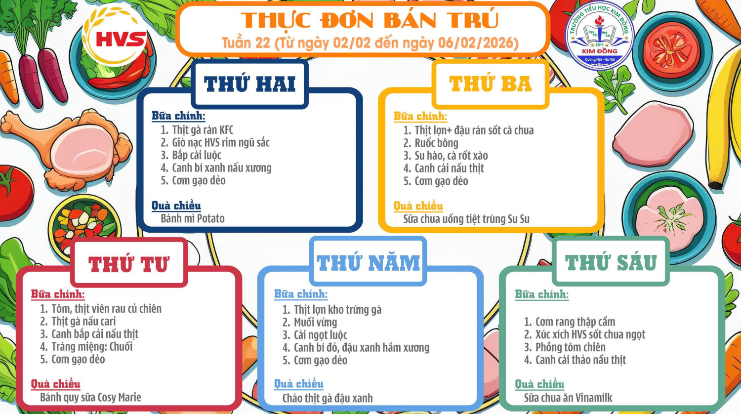 THỰC ĐƠN BÁN TRÚ TUẦN 22