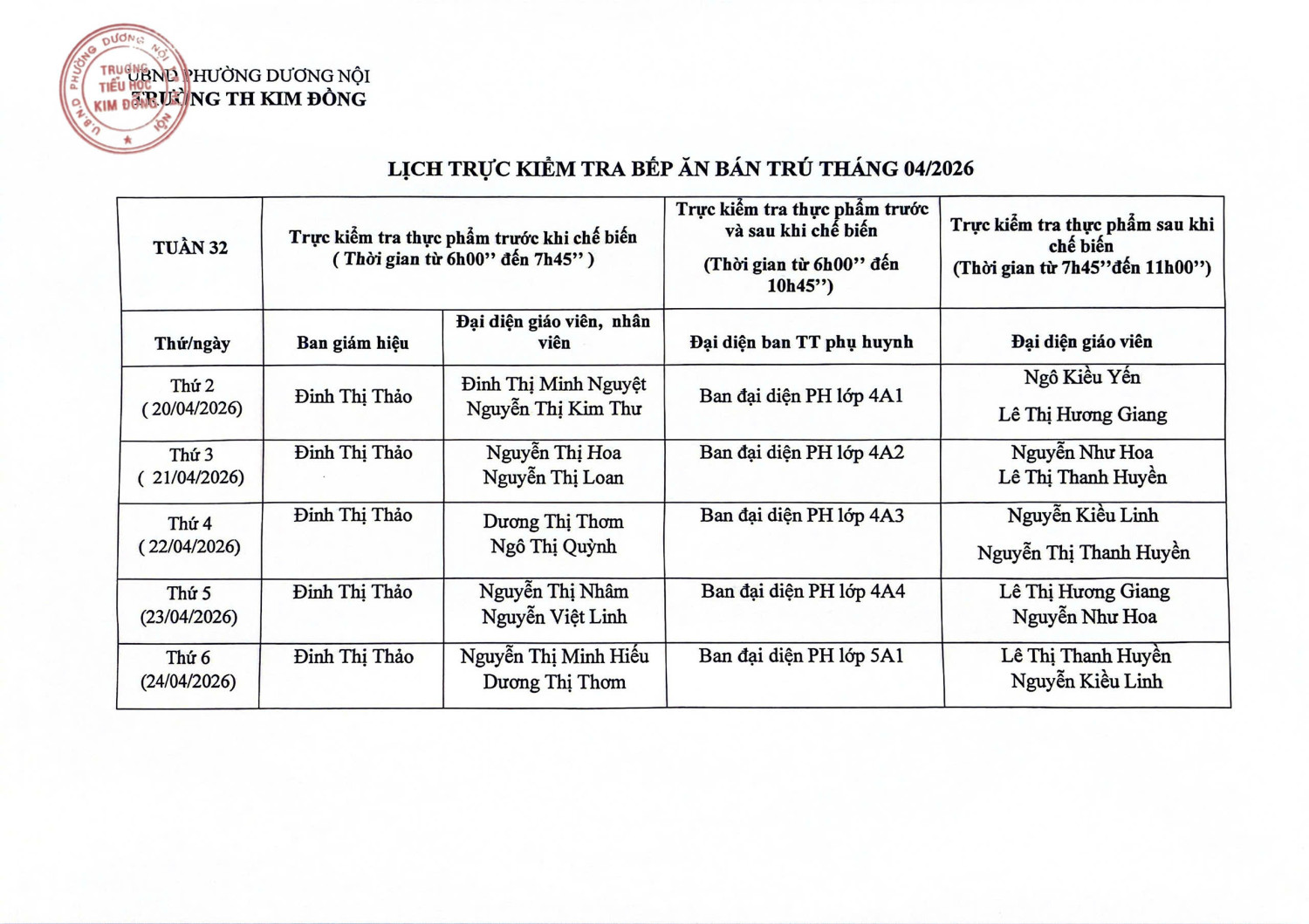 Lịch kiểm tra bếp tuần 32